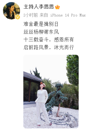 10月9日,主持人李思思在社交平台发文,疑似从央视离职:“难舍最是揖别日;丝丝杨柳谢东风;十三载奋斗,感恩所有;启前路风景,沐光而行。”
