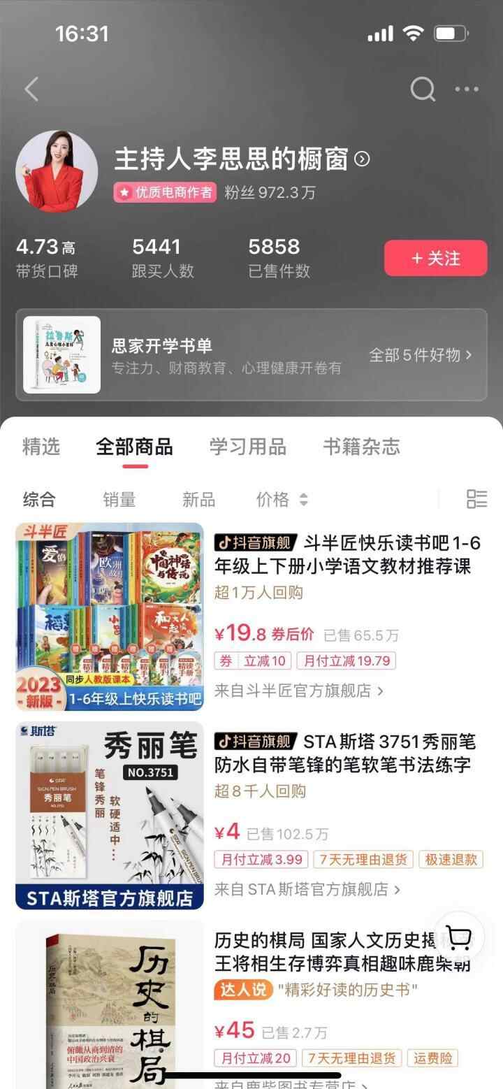 在“主持人李思思”的抖音号,除了分享工作和生活,还开通“商品橱窗”功能。在商品橱窗区有36件好货,显示5441个跟买人数以及5858笔已售件数,类别为文具、书籍学习用品等。