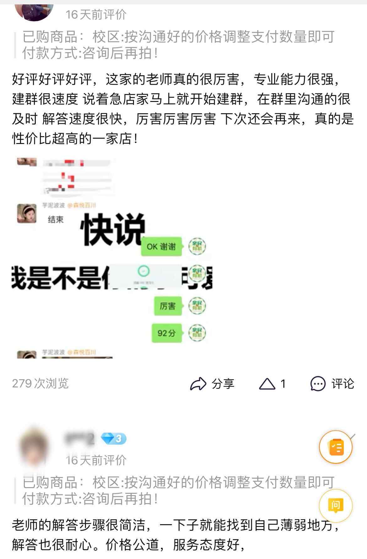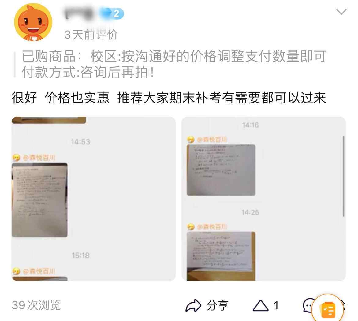 以小欢的店铺为例,不少人在评论区晒出答题的照片,其中不乏疑似拍摄于考场的图片,评论基本为好评——“价格实惠,推荐大家期末补考有需要都可以过来”“老师认真负责,不会就问,期末考试不要担心,这家值得你信任”“这家的老师专业能力很强,下次还会再来”……