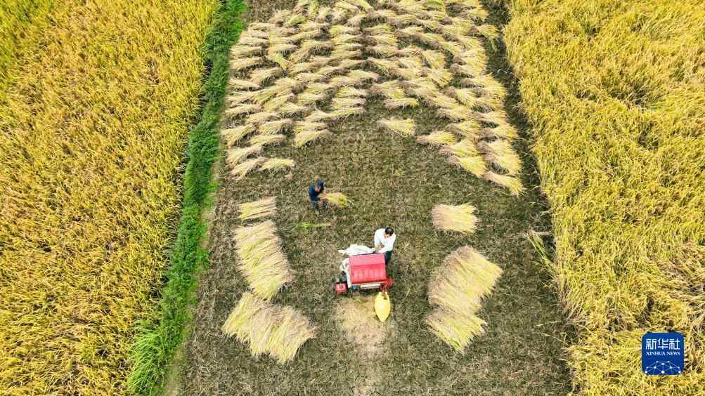 10月11日,在湖南省衡阳市衡东县大浦镇,村民驾驶农机收割水稻(无人机照片)。