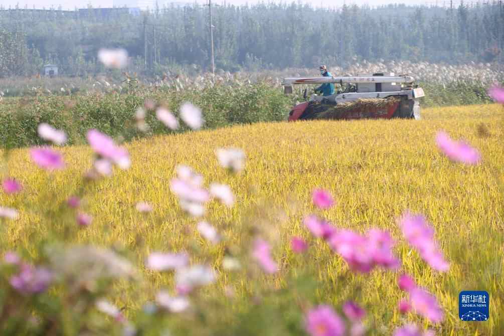 10月11日,村民驾驶收割机在山东省济南市槐荫区吴家堡街道七里铺村收割水稻。