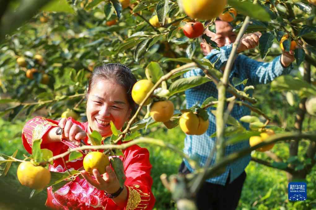 10月11日,湖北省宜昌市秭归县九畹溪镇九畹堂村村民在采摘苹果柿。
