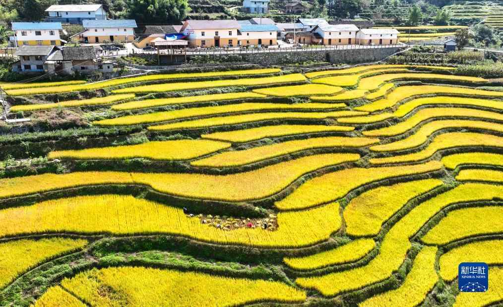 10月11日,湖北省宜昌市秭归县沙镇溪镇长春村村民在田间收获高山冷水稻(无人机照片)。