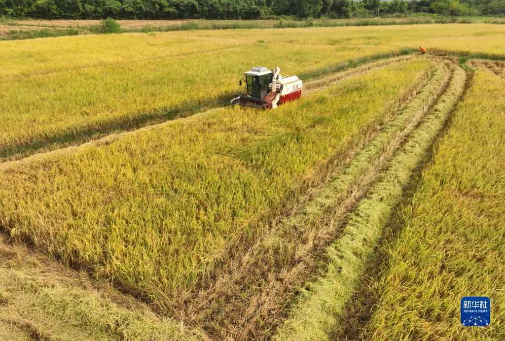 10月11日,在湖南省衡阳市衡东县大浦镇,村民驾驶农机收割水稻(无人机照片)。