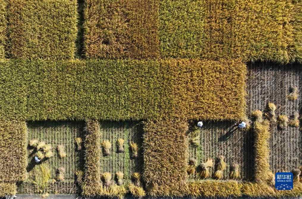10月11日,农民在江苏扬州市农科院的试验田里劳作(无人机照片)。