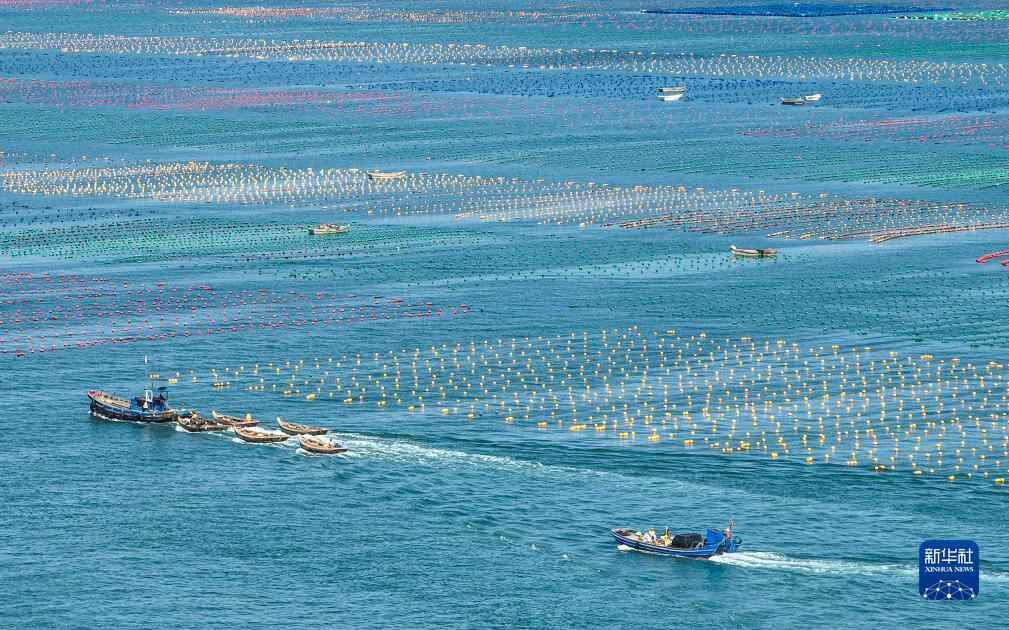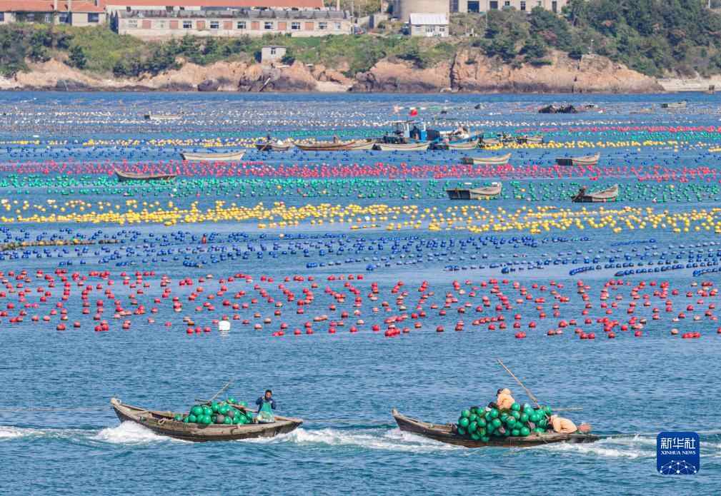 金秋时节,在山东省荣成市,各大海洋牧场海上养殖区一派繁忙景象,渔民驾驶渔船、舢板出海作业,在碧海上“绘”出一幅幅秋日渔耕图。