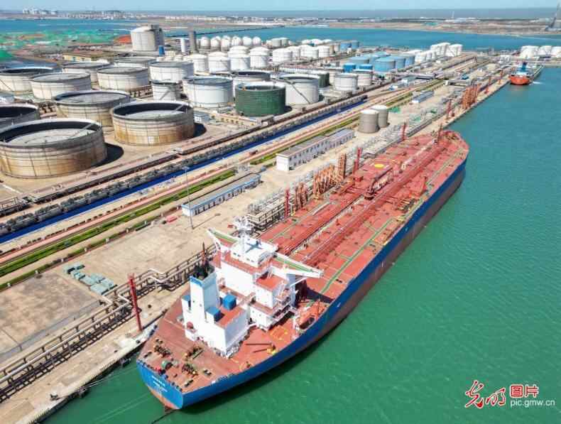 2023年4月7日,山东港口烟台港,一艘大型油轮正在卸油。烟台港推进西港区LNG等项目的施工建设,增强港口的能源物流储备和输送能力,以更高的储运效率保障能源供应链稳定畅通。(唐克摄/光明图片)