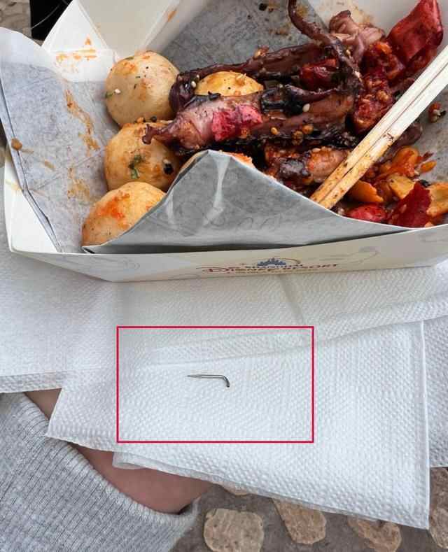 10月9日,有网友称,在迪士尼乐园的海怪小吃摊位购买了一份鱿鱼蛋,不料竟在其中吃到了一枚弯曲的钉子!