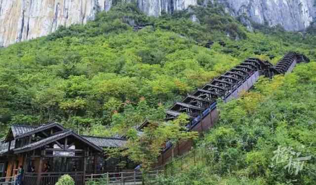 现代化的电梯出现在自然景区内是一件很违和的事情,但是这条手扶梯却没有这方面的烦恼,因为设计者采用了原木作为材料,屋顶则建成土家风格的青瓦盖顶,远远看去,手扶梯就像一条土家楼带,坐落在峡谷的树木间。