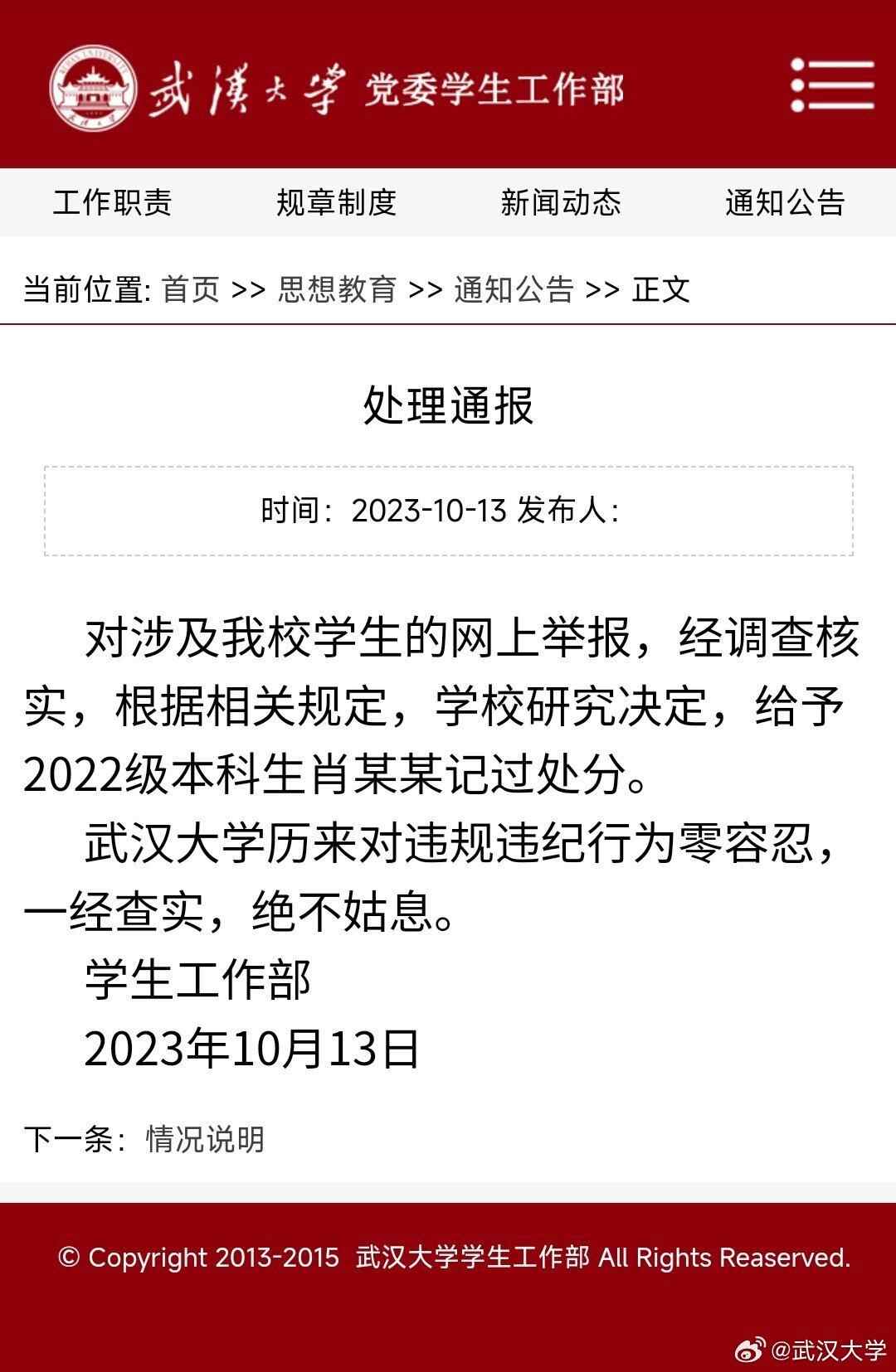 对涉及我校学生的网上举报,经调查核实,根据相关规定,学校研究决定,给予2022级本科生肖某某记过处分。