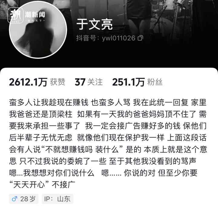 于文亮的个人介绍里,既说“不接广”,也说“如果有一天我的爸爸妈妈顶不住了,需要我来承担一些事了,我一定会接广告赚好多好多的钱,保他们后半辈子无忧无虑。”