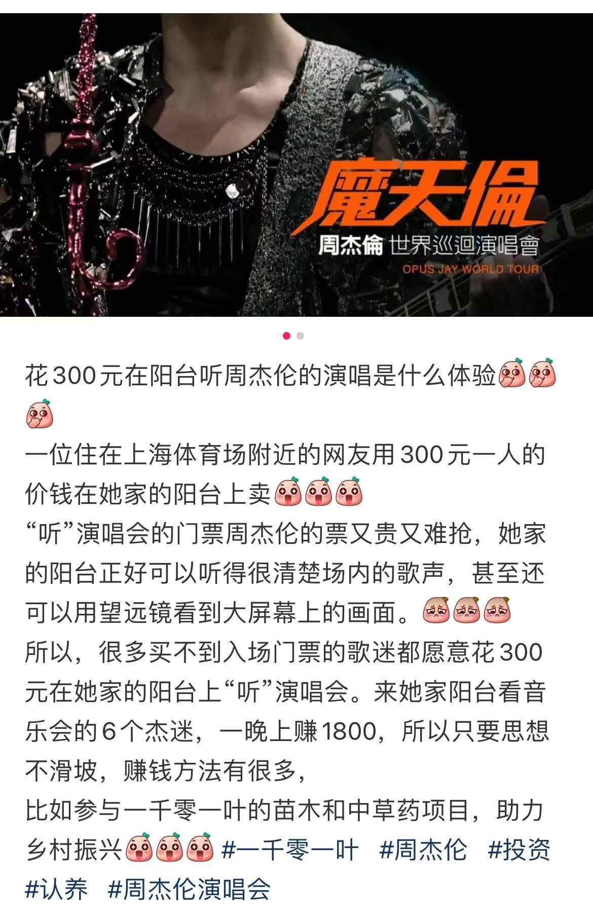 有网友发帖询问“有哪位好心人把阳台租给我看周杰伦演唱会吗”,配上上海体育场附近亮灯的居民楼。有人发帖称300元卖一张“阳台票”,也有人开价160元,还有卖票时限女性购买等要求。事实上,“阳台票”的帖子中不乏开玩笑的人,但也有人是认真的。