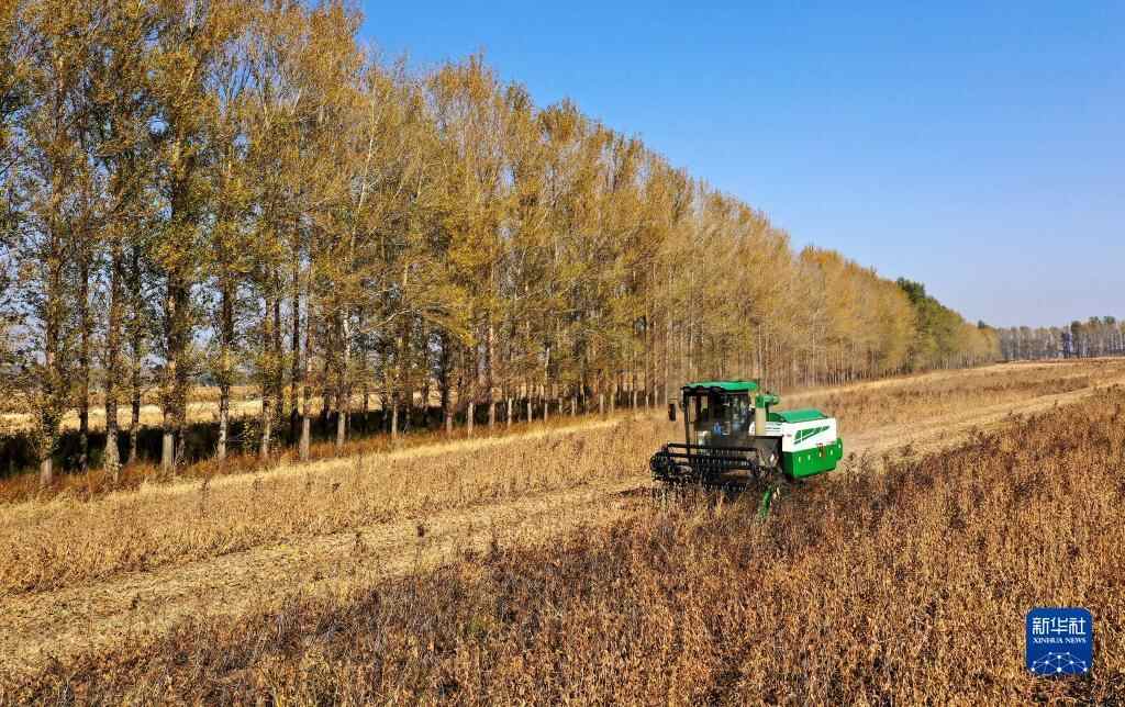 10月12日,收割机械在昌图县亮中桥镇亮中村的大豆田里作业(无人机照片)。