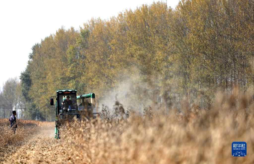 10月12日,收割机械在昌图县亮中桥镇亮中村的大豆田里作业。
