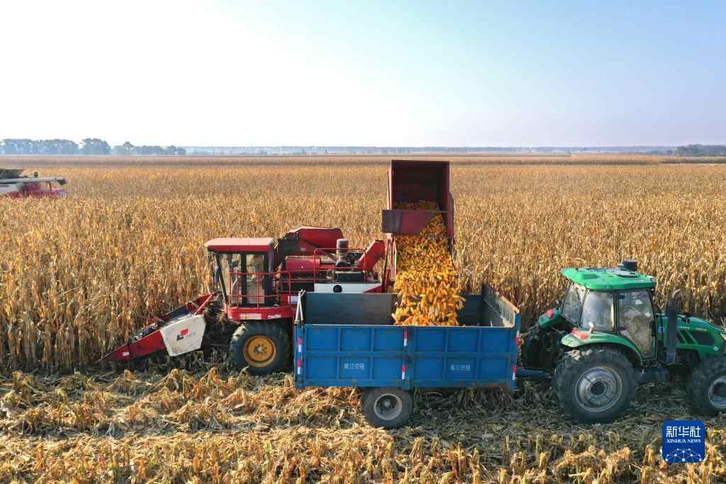 10月12日,收割机械在昌图县亮中桥镇永丰村的玉米田里装运刚刚收获的玉米(无人机照片)。