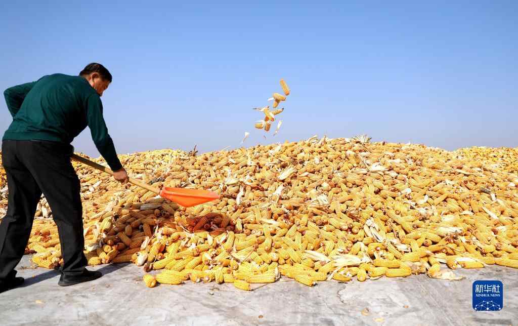 10月12日,一名工人在昌图县亮中桥镇永丰村的粮场内整理刚刚卸下的玉米。