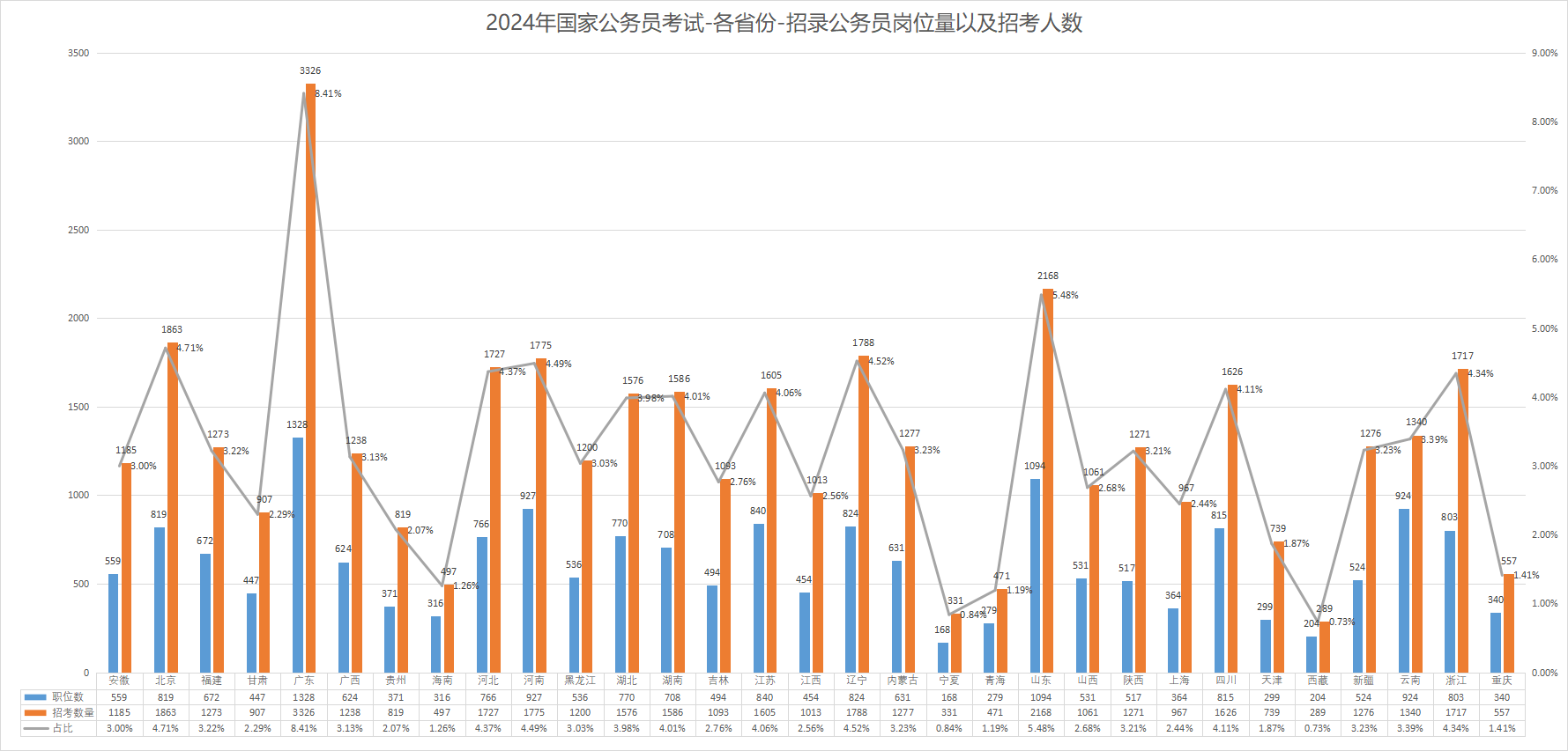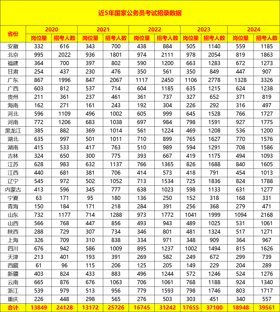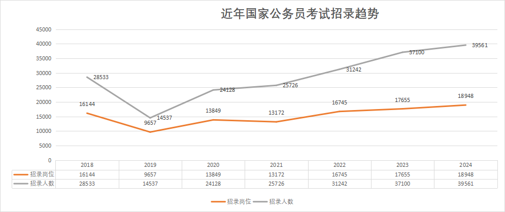 2024年共计设置了18948个岗位,计划招录39600人,相比2023年计划招录人数增加6.7%。华图教育首席研究员刘有珍表示,近五年一直有扩招趋势,对考生来说是好消息,意味着将有更多考生能加入公务员队伍。