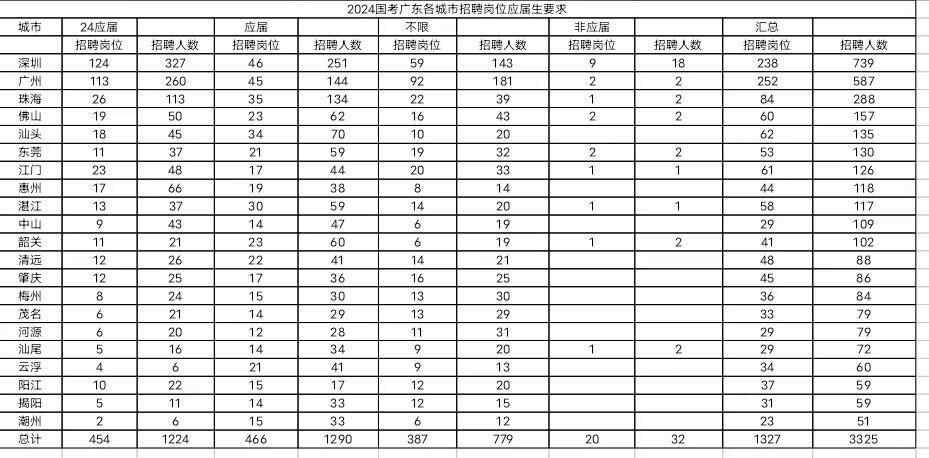 通过2024年国考广东岗位要求是否应届的数据分析出:广东招录3325人,其中要求2024年应届生的岗位有1224人,占比36.8%;其次要求应届的岗位人数有1290人,占比38.8%;不限的岗位人数有779人,占比23.43%;要求非应届的岗位人数有32人,占比0.96%,从数据可以看出,明年国考的招录对象更多的是偏向应届生。