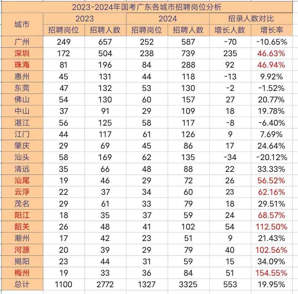 据统计,就国家公务员广东职位来说,2023年国家公务员考试广东职位共计招录2772人,招聘岗位1100个;2024年国家公务员考试广东职位共计招录3325人,招聘岗位1327个。华图教育广东师资管理与教研分院老师周妙表示,广东的岗位数量、招录人数均有所增加,深圳、珠海、韶关、梅州、河源、汕尾、云浮、阳江地区都有明显增加。此外,深圳的招聘岗位、招录人数超过广州,有意报考的深圳的同学可抓紧机会“上岸”。