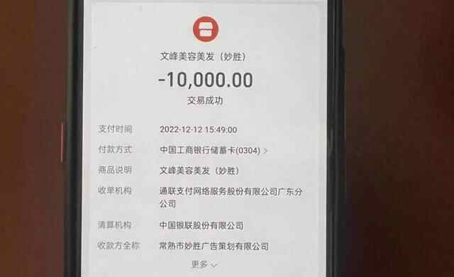 任阿姨还指出,哥哥转账的收款方显示为“常熟市妙胜广告策划有限公司”,仅在商品说明处标注“文峰美容美发(妙胜)”。明明在文峰消费,为何收款方却是外地的广告公司?这其中是不是又暗藏猫腻?