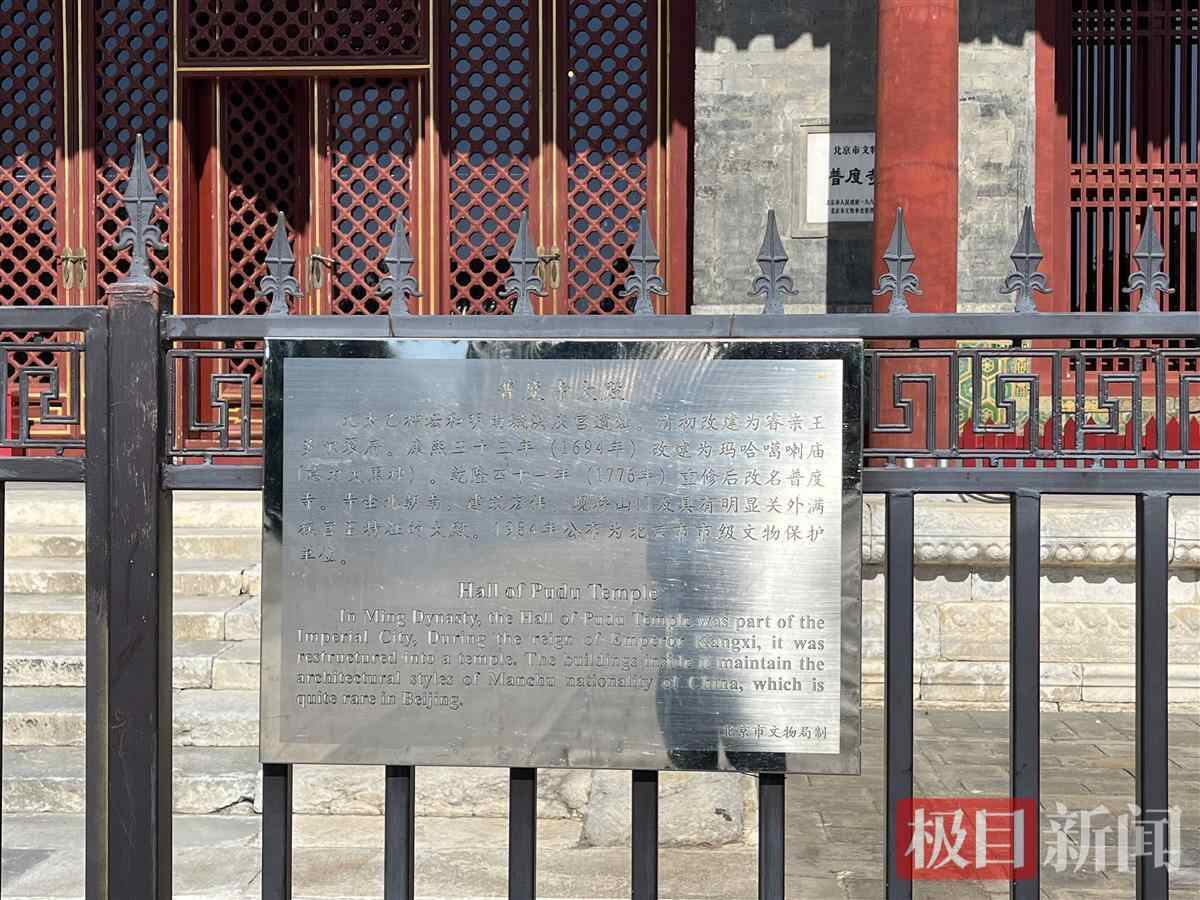 随后,记者走访了位于该房屋附近的普度寺,寺院内立有“睿亲王多尔衮”的塑像。普度寺大殿门口的介绍牌显示,该处为元太乙神坛和明南城洪庆宫遗址,清初改建为睿亲王多尔衮府,乾隆四十一年重修后改名普度寺。