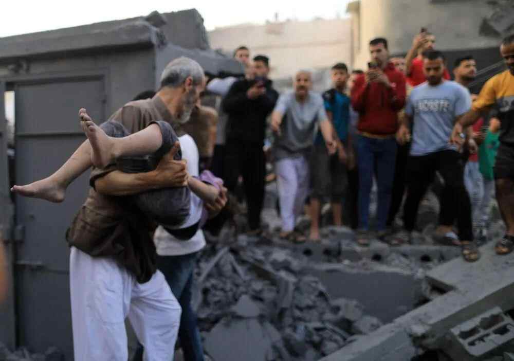 10月14日,在加沙地带南部城市汗尤尼斯,人们在遭以色列空袭炸毁的建筑中救援。图/新华社发