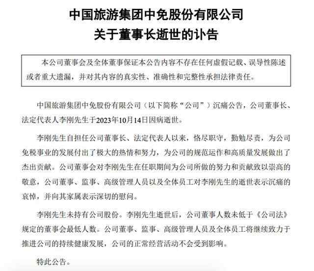 中国中免表示,李刚自担任公司董事长、法定代表人以来,恪尽职守,勤勉尽责,为公司免税事业的发展付出了极大的热情和努力,为公司的规范运作和高质量发展做出了杰出贡献。公司董事会对李刚在任职期间为公司所做的努力和贡献致以崇高的敬意,公司董事、监事、高级管理人员以及全体员工对李刚的逝世表示沉痛的哀悼,并向其家属表示深切的慰问。