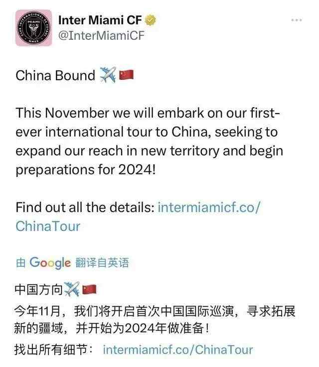国际迈阿密俱乐部在官方公告中写道:“启程,目的地中国!今年11月,我们将开启首次中国行,寻求拓展新的疆域,并为2024年新赛季做准备!”