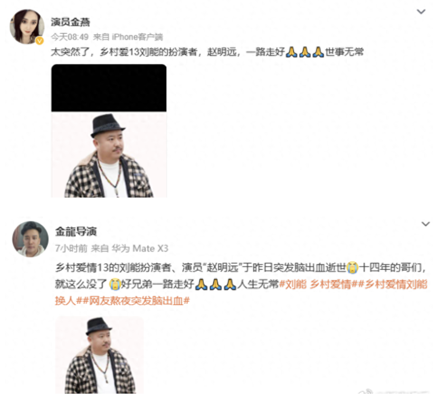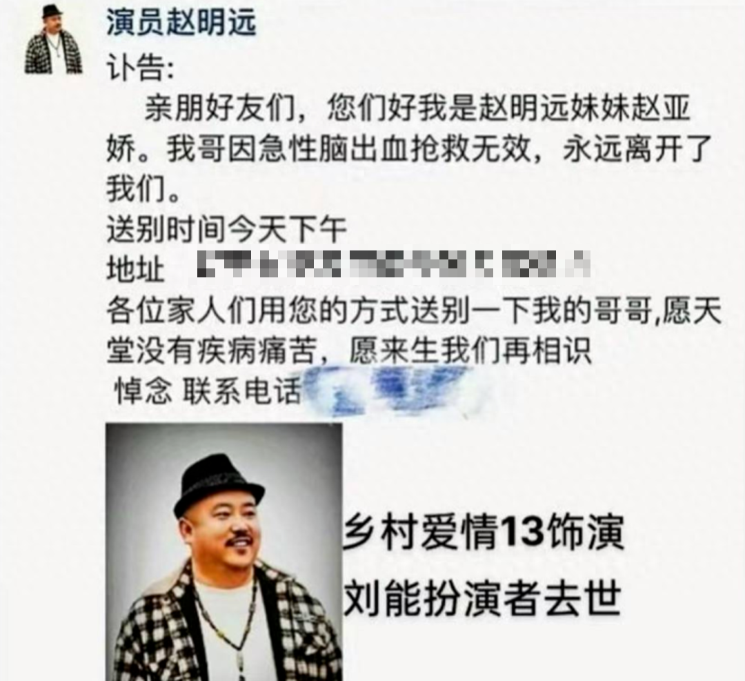 10月14日,《乡村爱情13》中刘能扮演者赵明远突发脑出血去世,享年42岁。他的妹妹发布讣告,证实哥哥去世的消息。