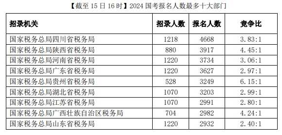据了解,报名人数最多的十大部门均来自国考的招录大户——税务系统,目前报名人数最多的部门来自西南地区的国家税务总局四川省税务局,招录1218人,已经有4668人报名,超越了招录人数更多的国家税务总局广东省税务局、河南省税务局和山东省税务局。