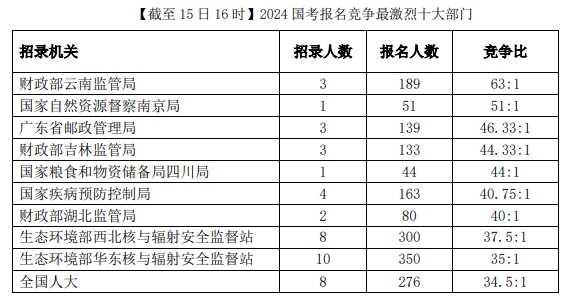 在所有招录部门中,目前竞争最激烈的部门依然来自西南地区——财政部云南监管局,仅招录3人,但已有189人报名,竞争比高达63:1。