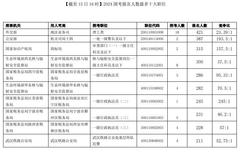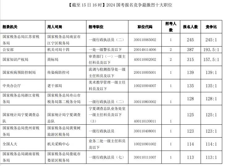 竞争最激烈的职位,来自国家税务总局南京市江宁区税务局一级行政执法员(二)(职位代码300110065002)这一职位,仅招录1人,已经有245人提交报名申请,该职位不限制工作经历、不限制政治面貌、无需服务基层项目经历,也不需要提供资格证书,相对来说要求很宽泛。