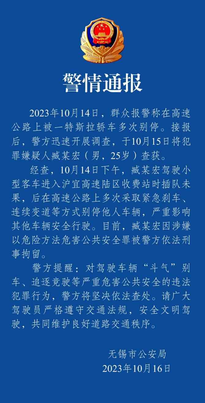 无锡警方通报“特斯拉车主高速多次别车”:危害公共安全,刑拘