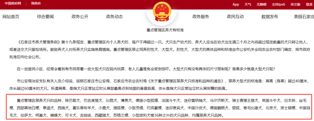 而像石家庄等城市的重点管理区,则列出了“准养犬清单”,并对犬只的肩高、体长提出了要求,而太原等城市,则是列出重点管理区“禁养犬清单”。