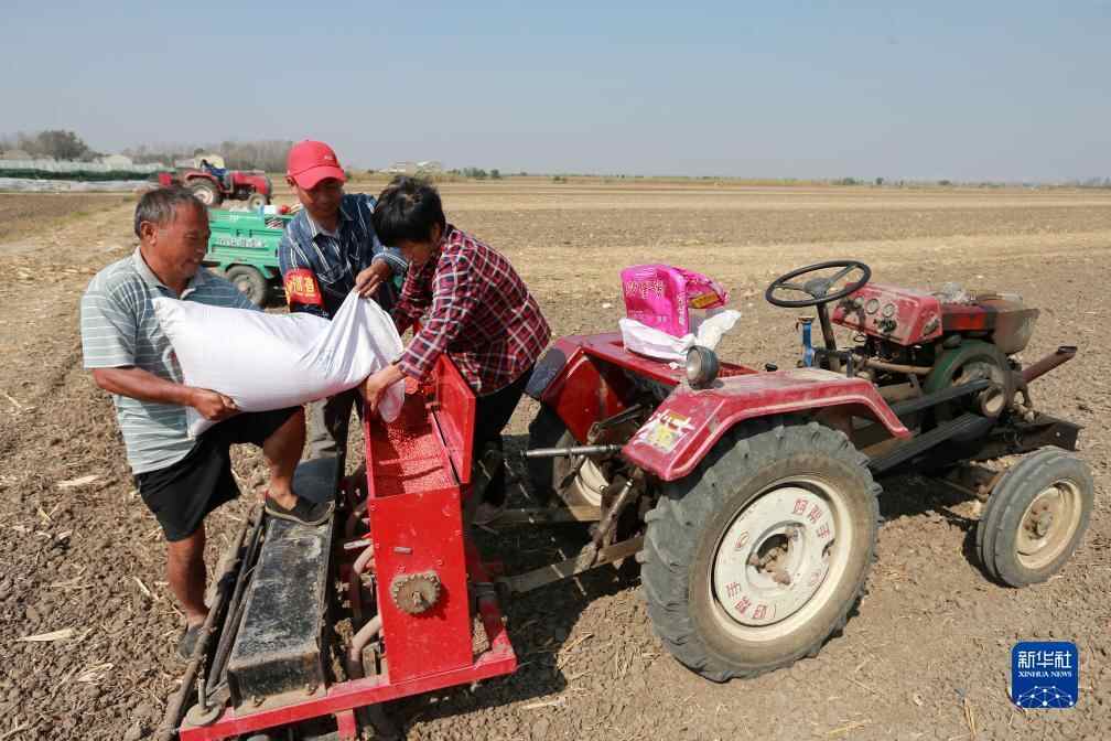10月17日,在淮北市濉溪县双沟村,农民为播种机添加小麦种子。