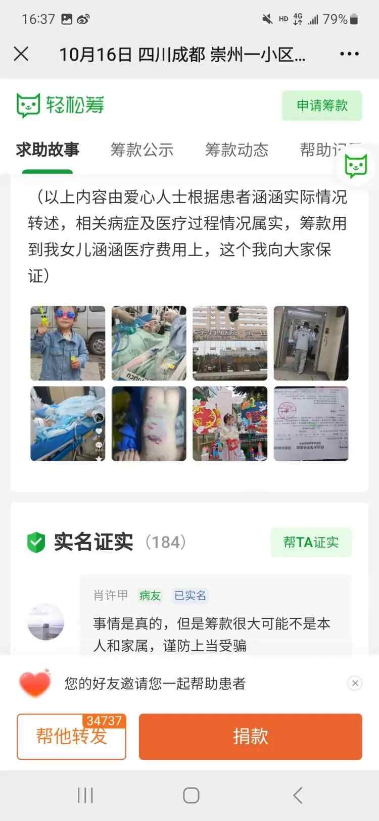 记者注意到,筹款链接中家属已更新最新动态。家属称,涵涵遇袭及救治情况是爱心人士根据实际情况转述整理,相关病症及医疗过程属实,筹款将用到涵涵医疗费用上,"这个我向大家保证。"