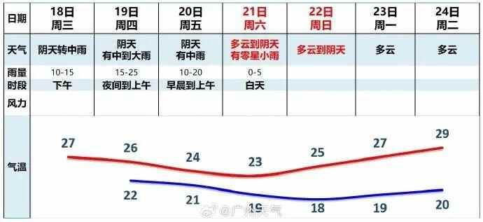 在风雨天气中,广州市区日最高气温将从18日余下时间的27℃下降至21日的23℃,伴随风雨影响减弱,日最高气温将从21日的23℃回升至24日的29℃。但相比日最高气温,日最低气温回升较慢,预计从19日的22℃跌至21日至23日期间的18~19℃。