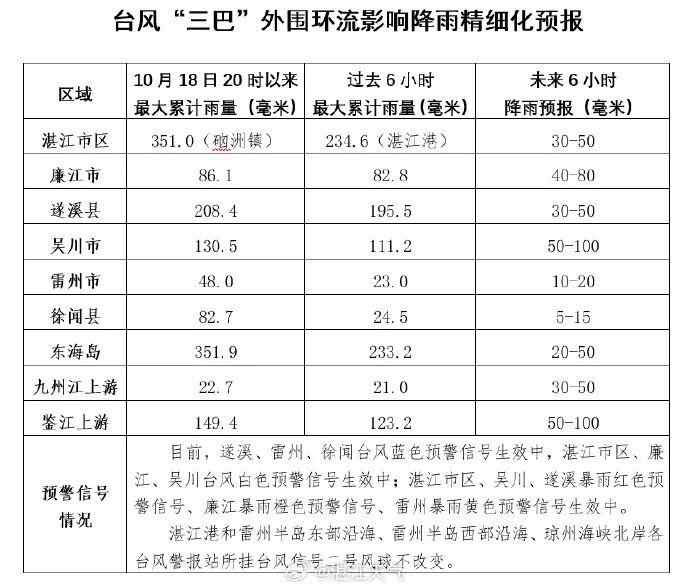 过去3小时茂名化州市普降中到大雨局部暴雨,预计强降水持续,化州市气象台10月19日11时10分将全市各镇街暴雨黄色预警信号升级为暴雨橙色预警信号,请注意防御。预计受台风“三巴”影响,未来6小时高州市有大到暴雨,高州市气象台10月19日10时05分发布暴雨黄色预警信号,请注意防御。今天到明天信宜市有大雨到暴雨局部大暴雨,信宜市气象台10月19日9时57分发布暴雨黄色预警信号。请注意防御强降水、山洪和地质灾害。