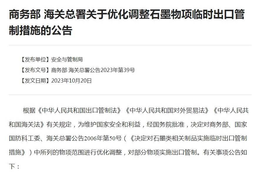10月20日,中国商务部会同海关总署发布关于优化调整石墨物项临时出口管制措施的公告,将此前实施临时管制的球化石墨等3种高敏感石墨物项正式纳入两用物项出口管制清单;同时,取消对炉用碳电极等5种主要用于钢铁、冶金、化工等国民经济基础工业的低敏感石墨物项的临时管制。上述政策将于2023年12月1日起正式施行。