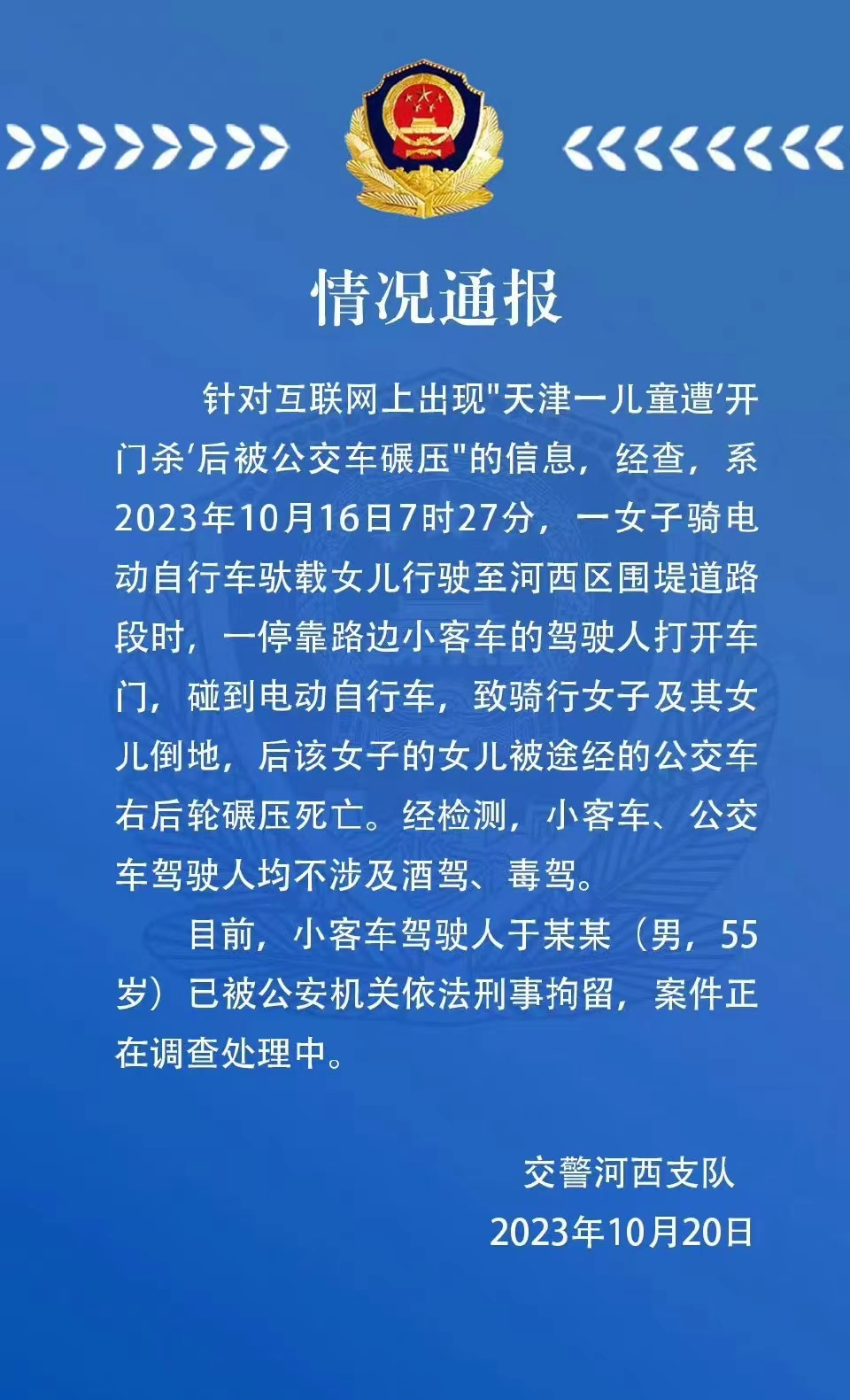 10月20日,天津河西交警发布通报称,小客车驾驶人已被公安机关刑事拘留。通报全文如下: