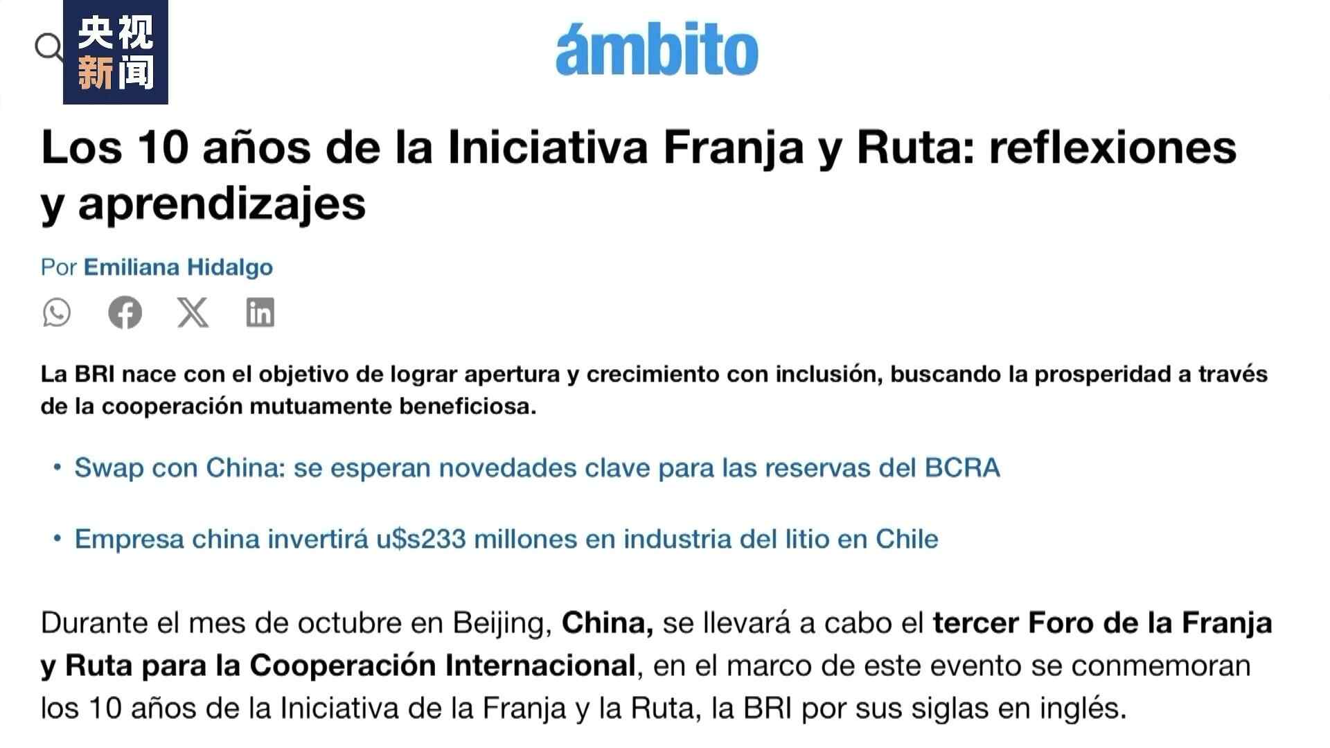 阿根廷著名经济类日报《金融界报》在官网发表评论文章,回顾了共建“一带一路”倡议的发展历程和带给世界的思考和借鉴。文章称,经过十年发展,该倡议已覆盖全球150多个国家,为世界互利共赢合作树立了榜样。
