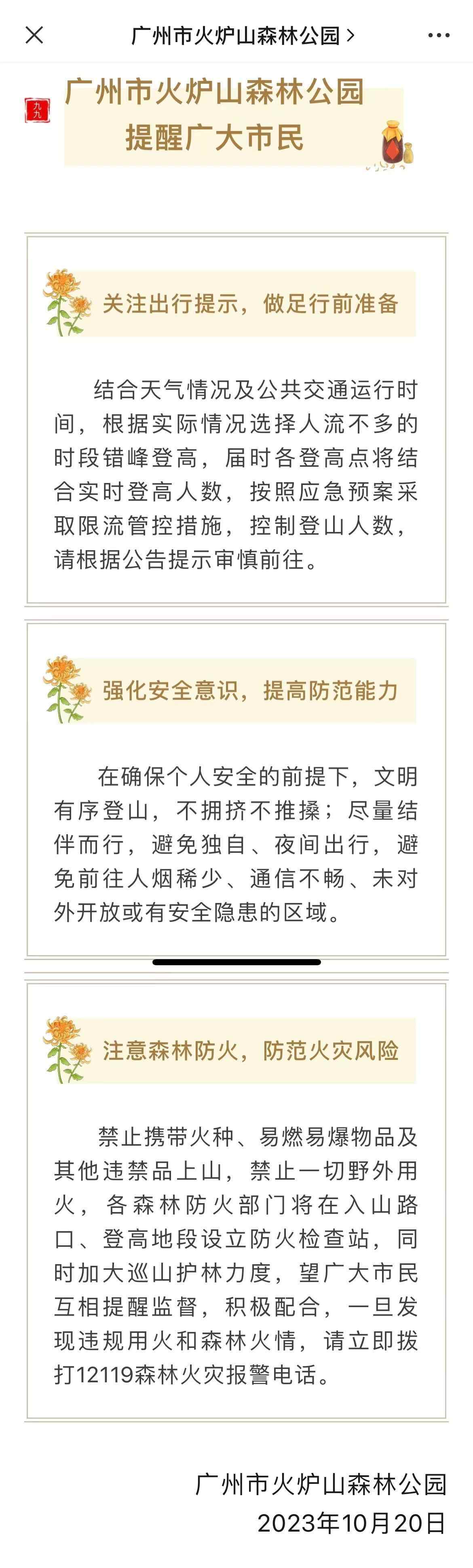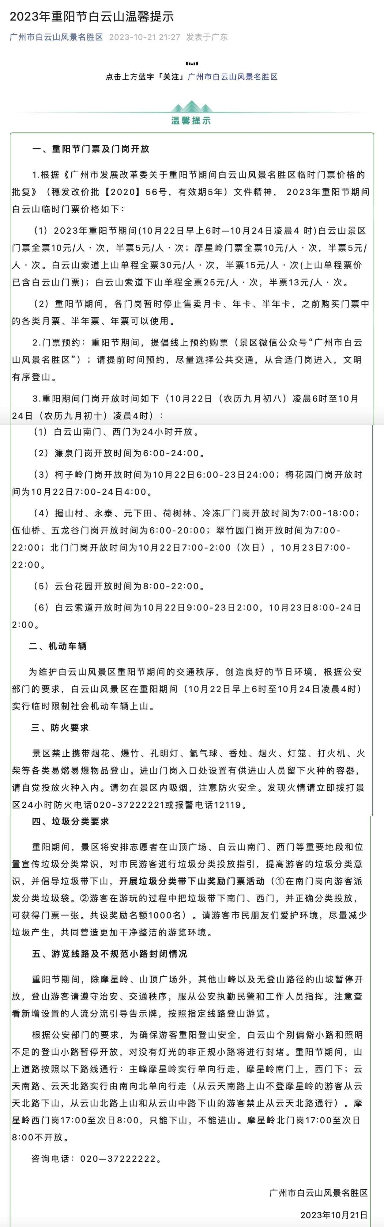 白云山风景名胜区发布温馨提示,对重阳节期间门票、门岗开放时间等作了说明。