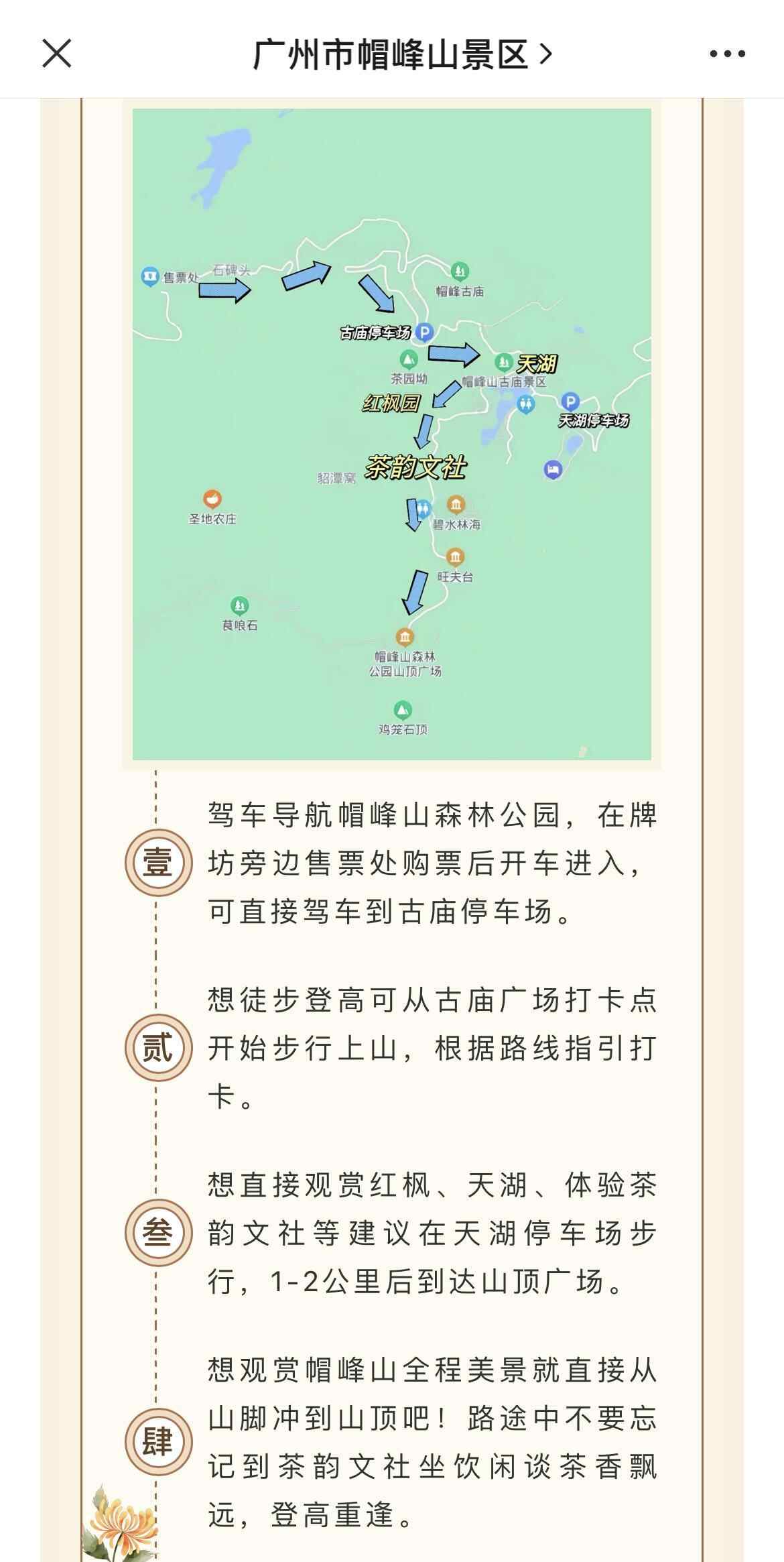 若市民想直接观赏红枫、天湖、体验茶韵文社等建议在天湖停车场步行,1-2公里后到达山顶广场。