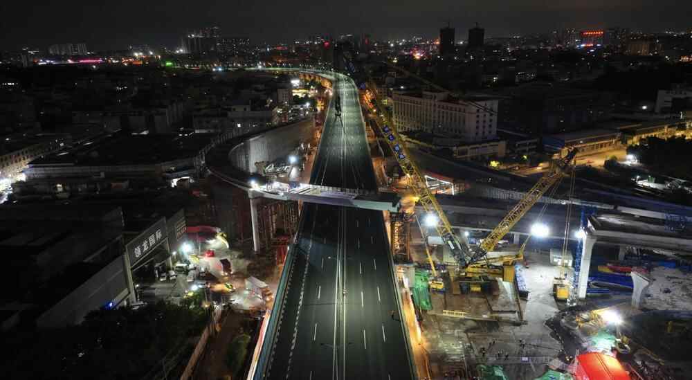 10月21日6时,随着5小时连续作业,由广州地铁集团建设、中铁广州局承建的广州白云(棠溪)站综合交通枢纽一体化建设工程(周边配套市政道路)施工总承包项目标段6(以下简称“白云二线市政道路项目”)上跨广清立交段钢箱梁顺利完成吊装,标志着白云二线市政道路结构施工正式进入尾声,为项目年底全线通车奠定了坚实基础。