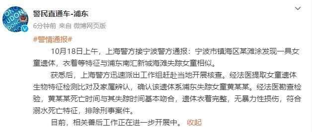 10月18日上午,上海警方接宁波警方通报:宁波市镇海区某滩涂发现一具女童遗体,衣着等特征与浦东南汇新城海滩失踪女童相似。