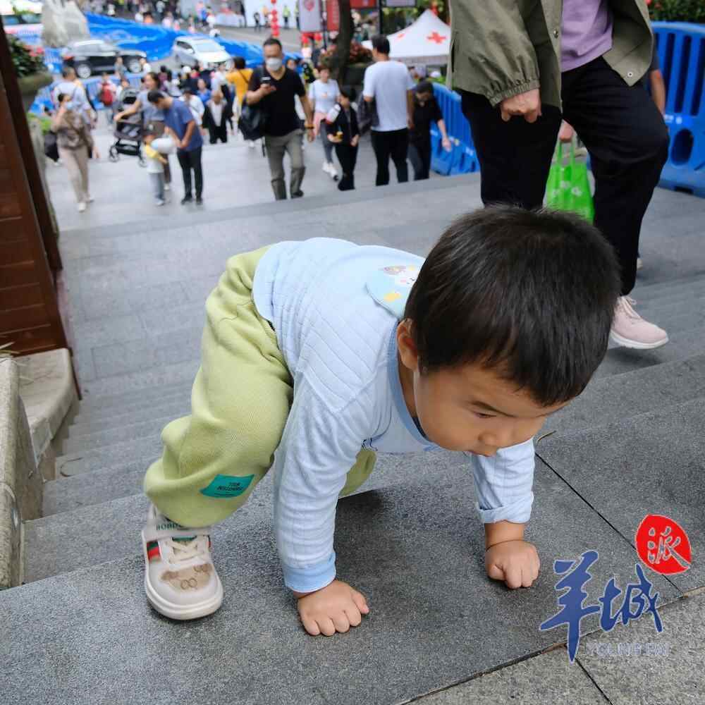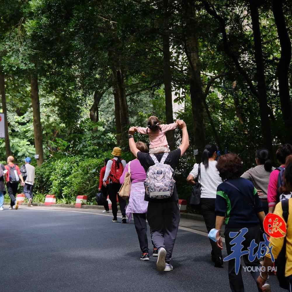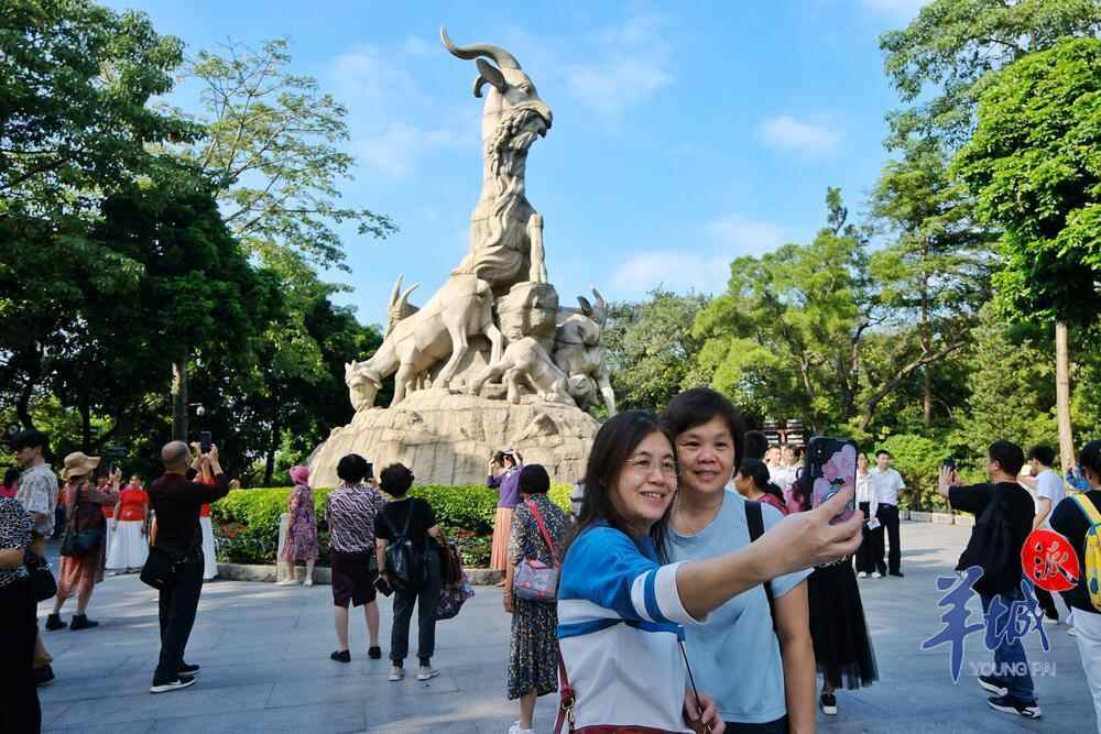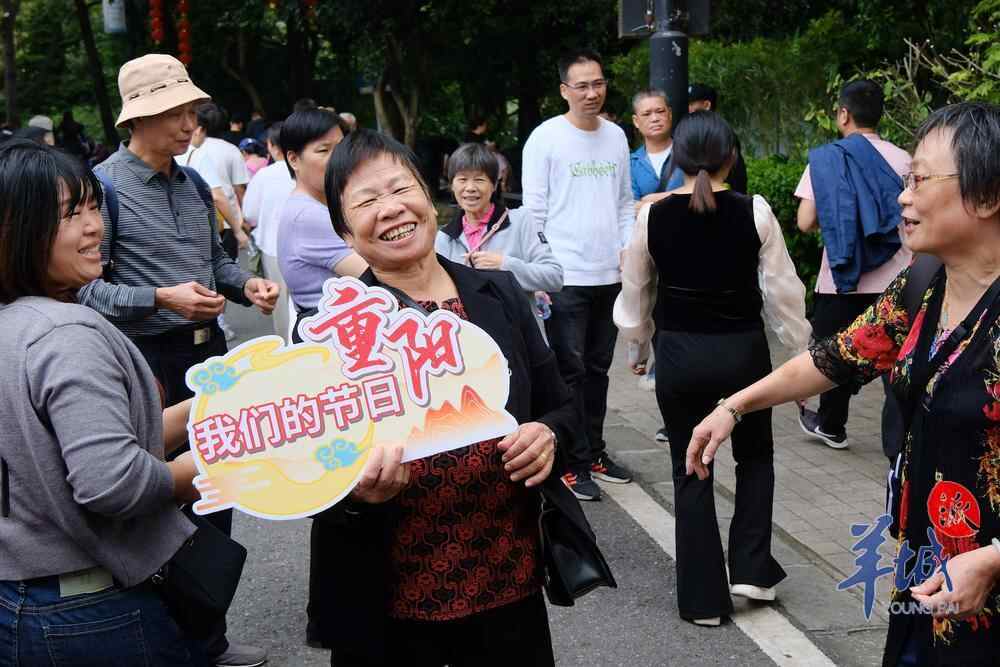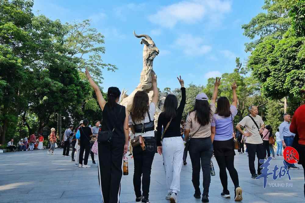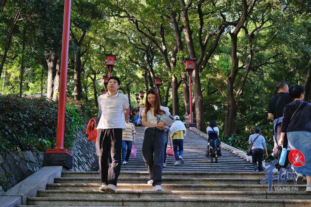 在越秀区的登高点,越秀山游人如织,市民登上百步梯“打卡”中山纪念碑、四方炮台、五羊雕像等景点。市民黄小姐说:“家距离越秀山近,我特意在重阳节约上闺蜜,相聚登山。”