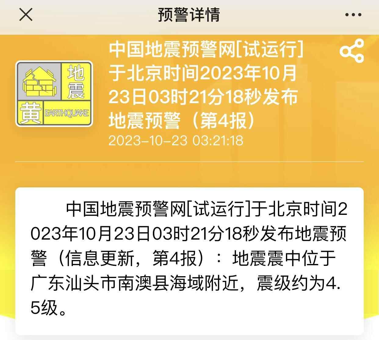 根据中国地震台网正式测定,10月23日3时20分,广东汕头市南澳县海域发生5.0级地震,震源深度10公里。结合中国地震台网速报微博评论区网友留言,粤闽交界不少网友反映有震感。