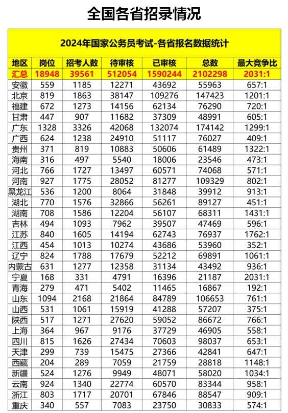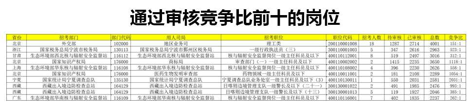 通过审核最大竞争比的岗位依然是统计局岗位,过审竞争比为2031:1,其次是国税的岗位,竞争比为1762:1,最后是综合岗的岗位,竞争比为1201:1。报考第九天,已经有1个过审竞争比达到2000的岗位。