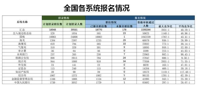 在15个系统中平均竞争比最大的三个系统为知识产权局、水利部门、统计局,平均竞争比分别是117.48:1、90.43:1、71.35:1。目前国考的过审平均竞争比为40.20:1。