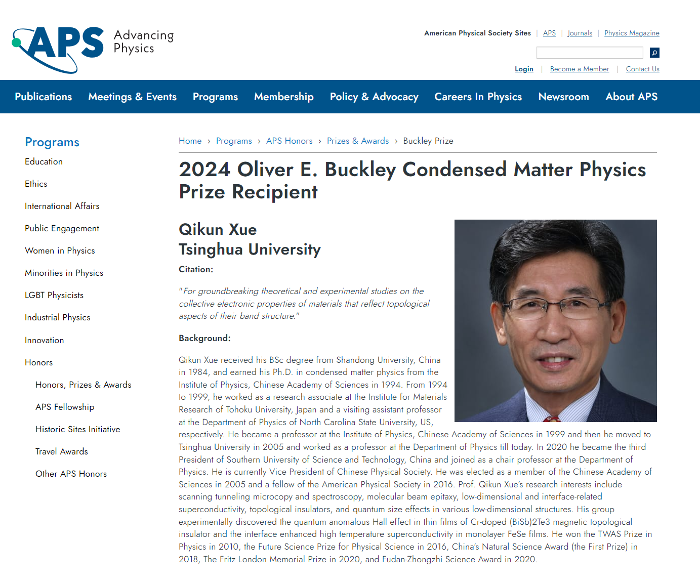 北京时间2023年10月24日,美国物理学会(American Physical Society)宣布中国科学院院士、清华大学教授,南方科技大学校长薛其坤获得本年度的巴克利奖(2024 Oliver E. Buckley Condensed Matter Physics Prize)。